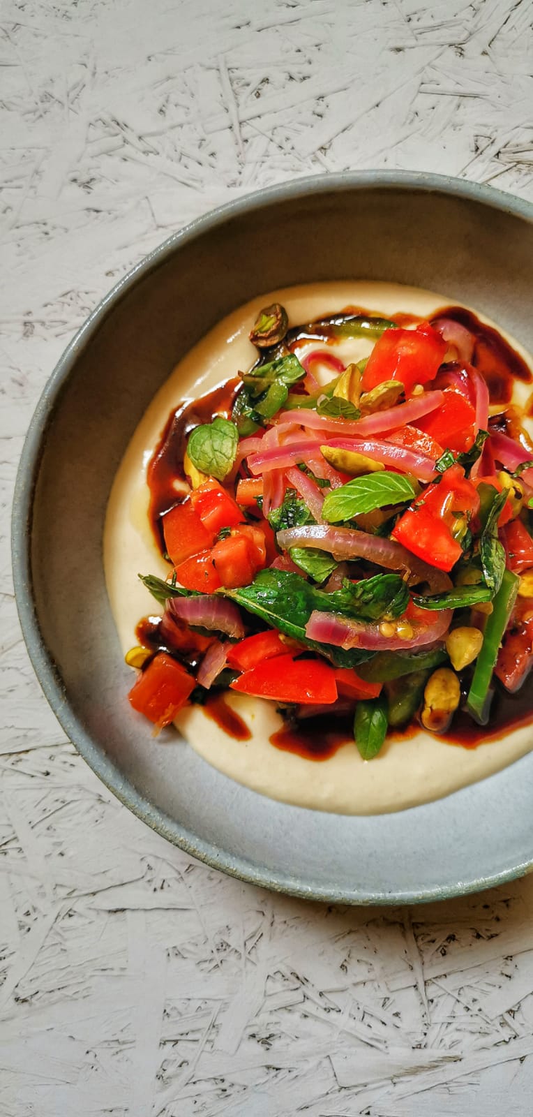 אבל צלחת קטנה ועליה פלחי עגבניות סופר טריות ובשרניות, קוביות בצל סגול, פלפל חריף, צנוברים וטעם חמצמץ מתוק שחיבר את הכול בהרמוניה מושלמת, הצליחה לחדור את ערפל הטעמים הכבד ונכנסה היישר לליבי.